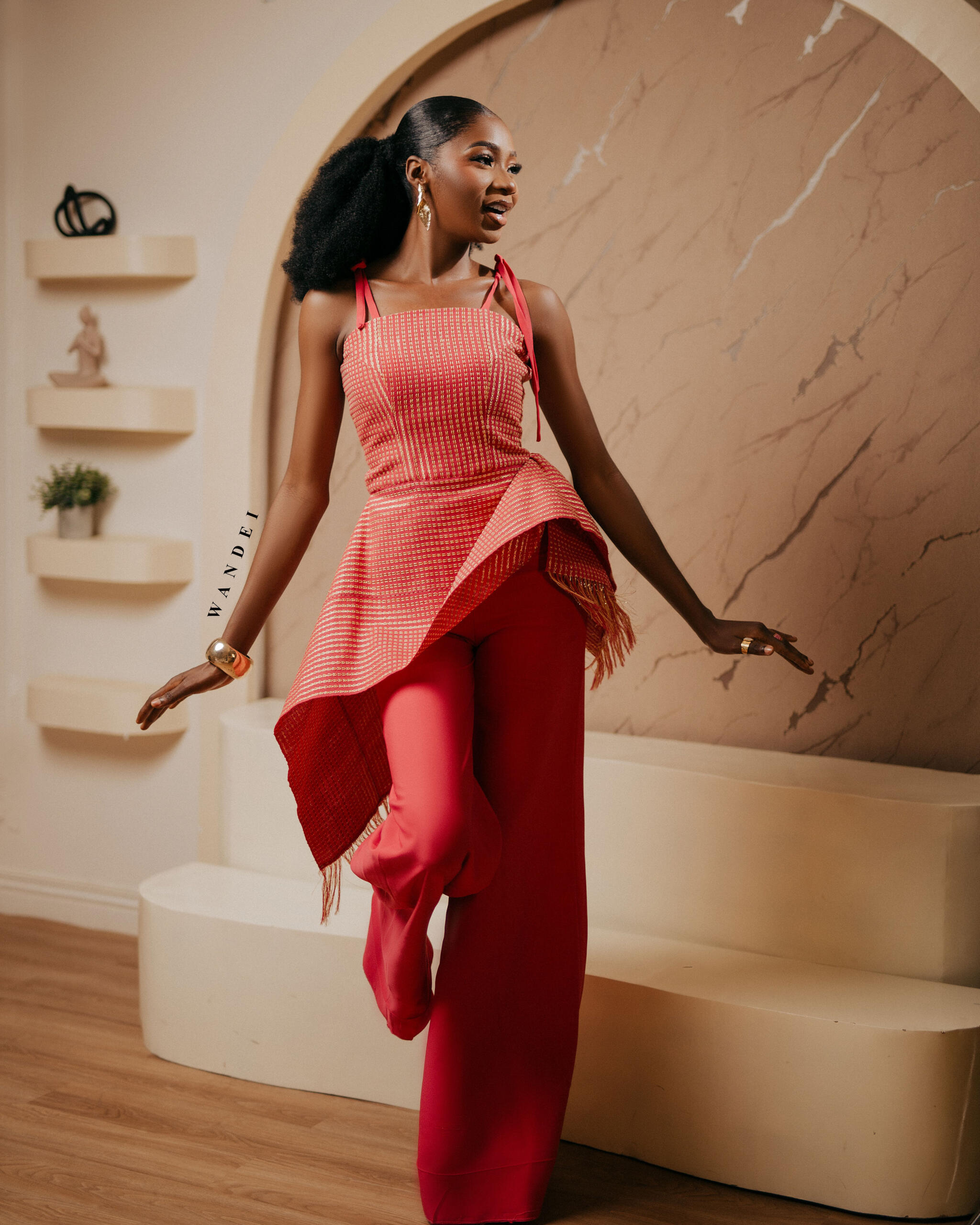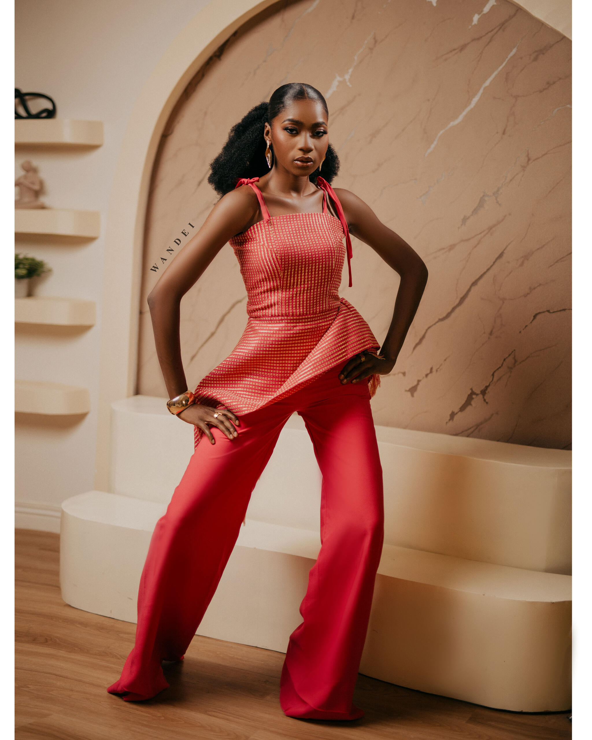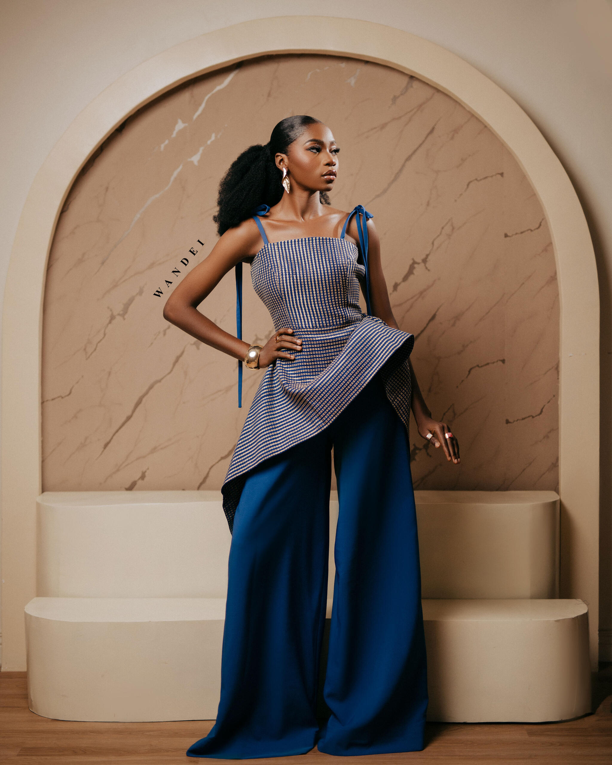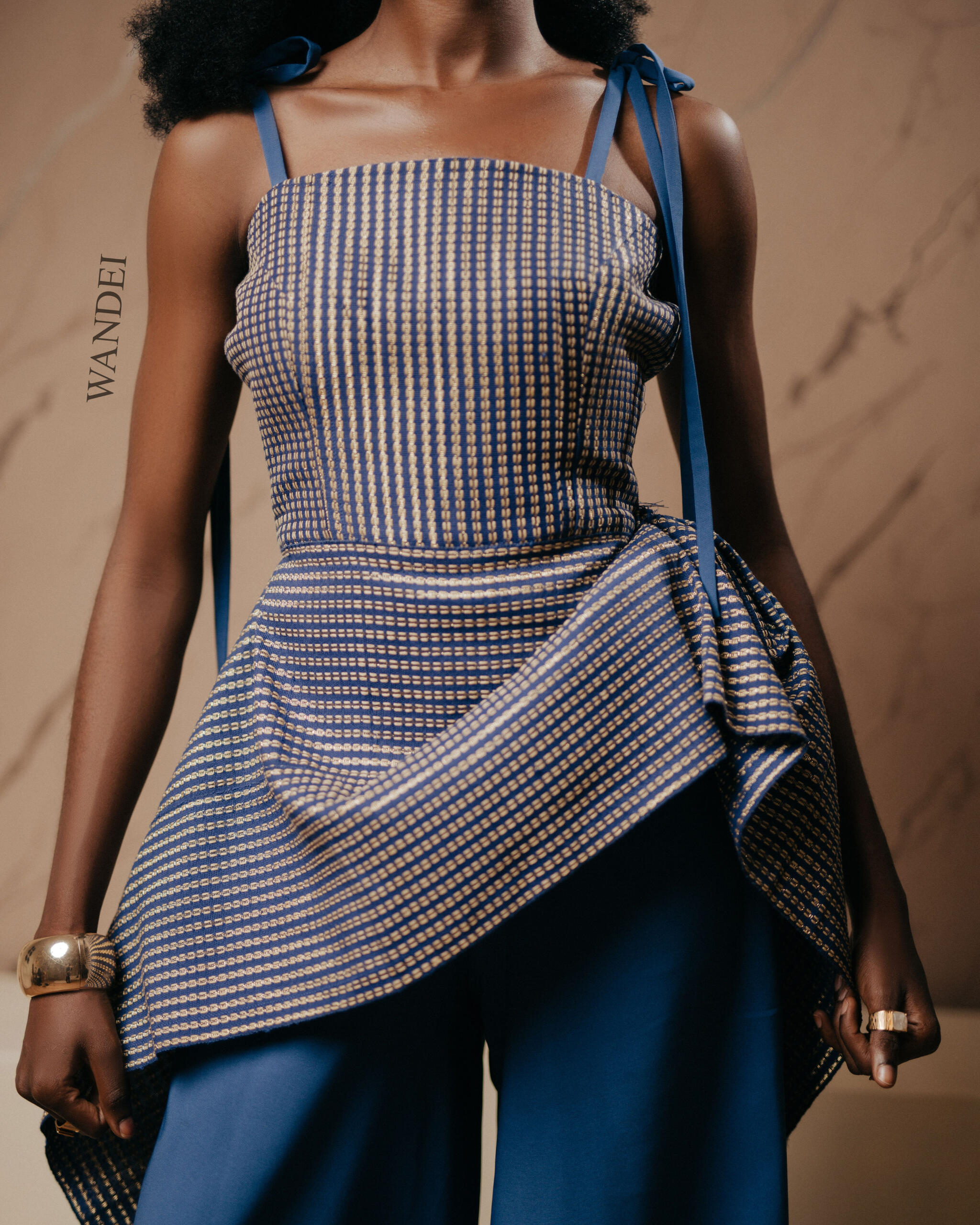 The top and asymmetric drape are tailored from rich locally woven Asooke