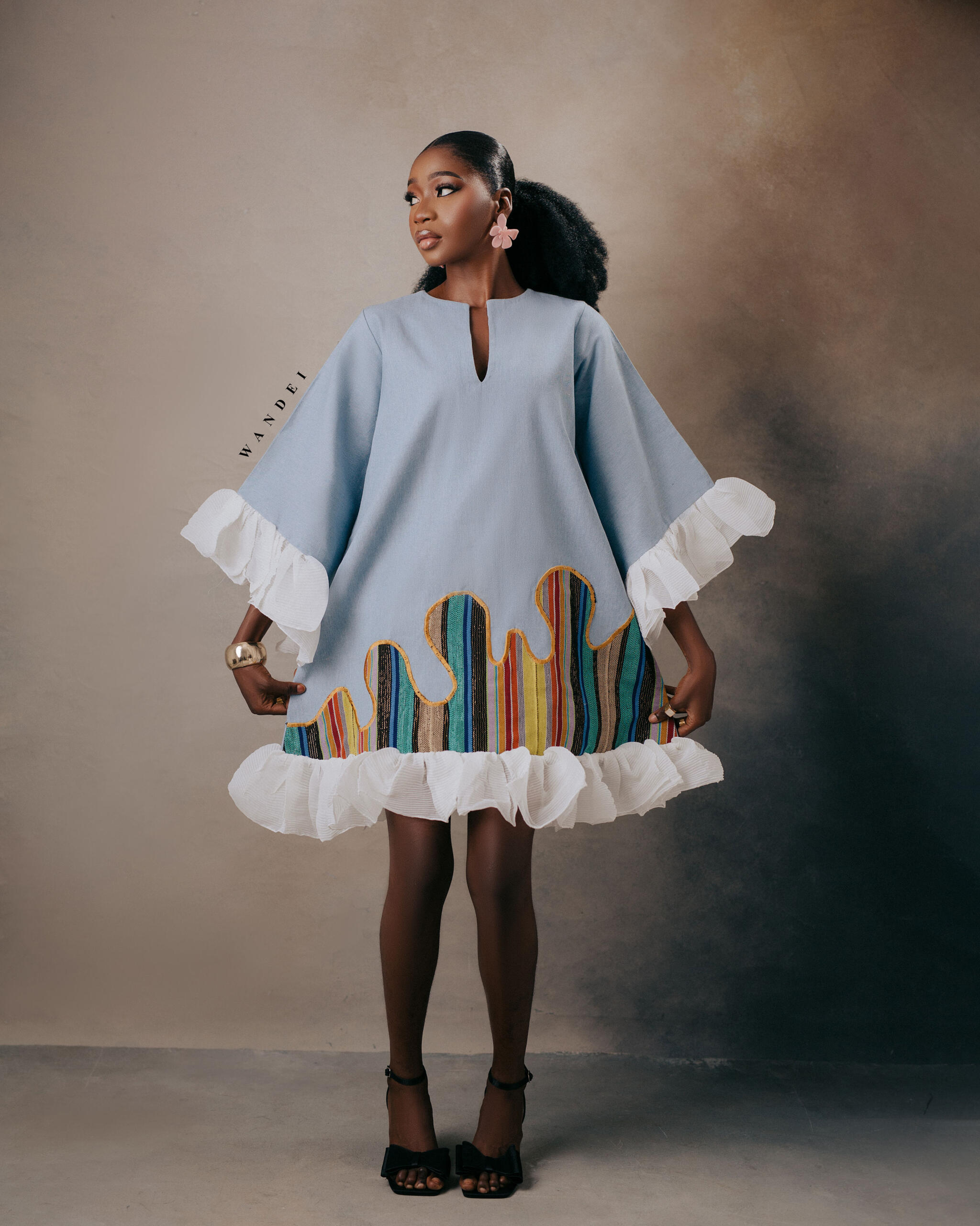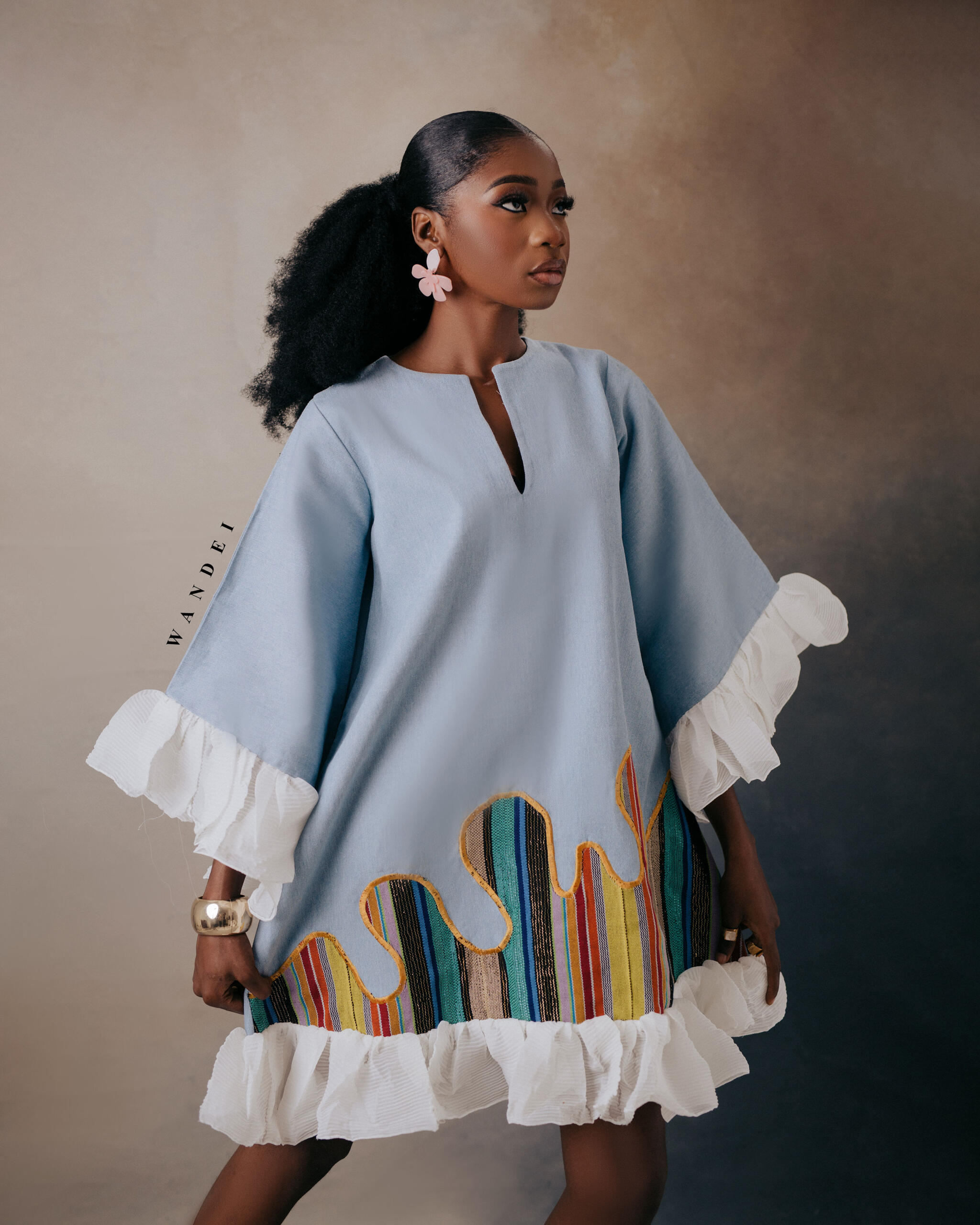 At the base, hand-embroidered Asooke panels in vibrant multicolors add a rich cultural statement, giving the dress its standout personality.